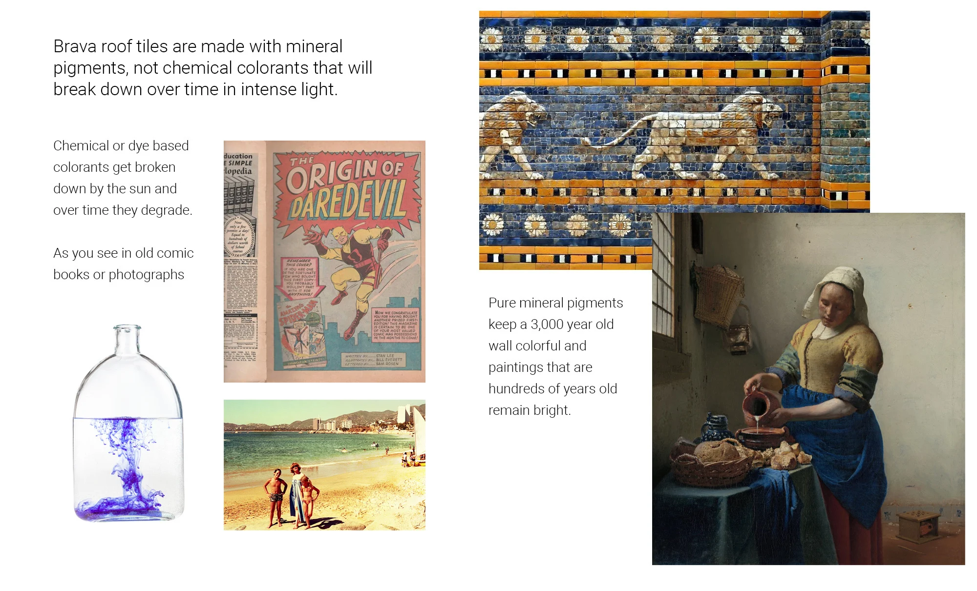 Unlike traditional dye-based colors that fade under UV rays, Brava tiles use mineral pigments through our patented ColorCast process. Inspired by the enduring hues of historical masterpieces, Brava Roofing Colors offer rich, vibrant shades that resist fading, backed by a 50-year transferable warranty.