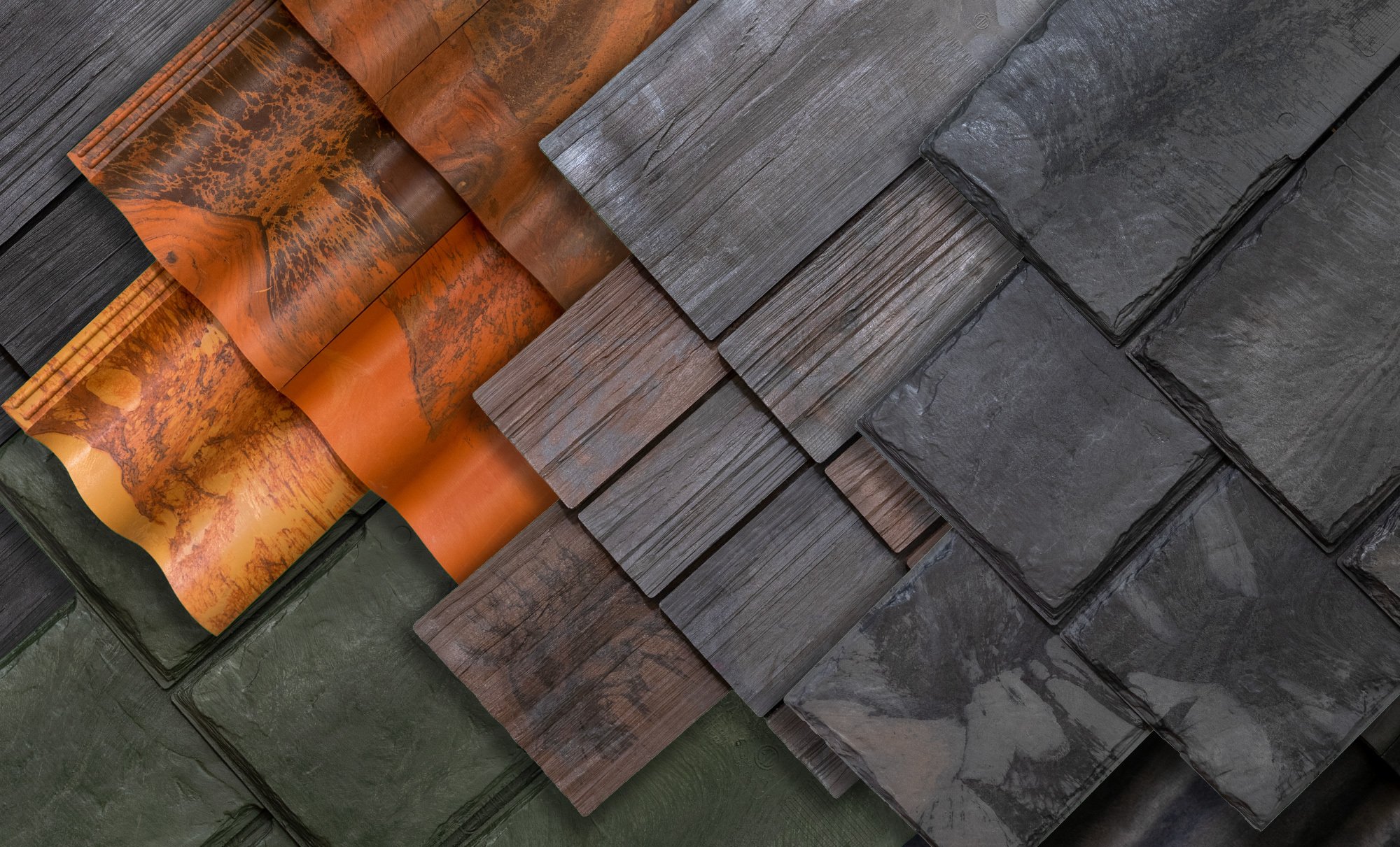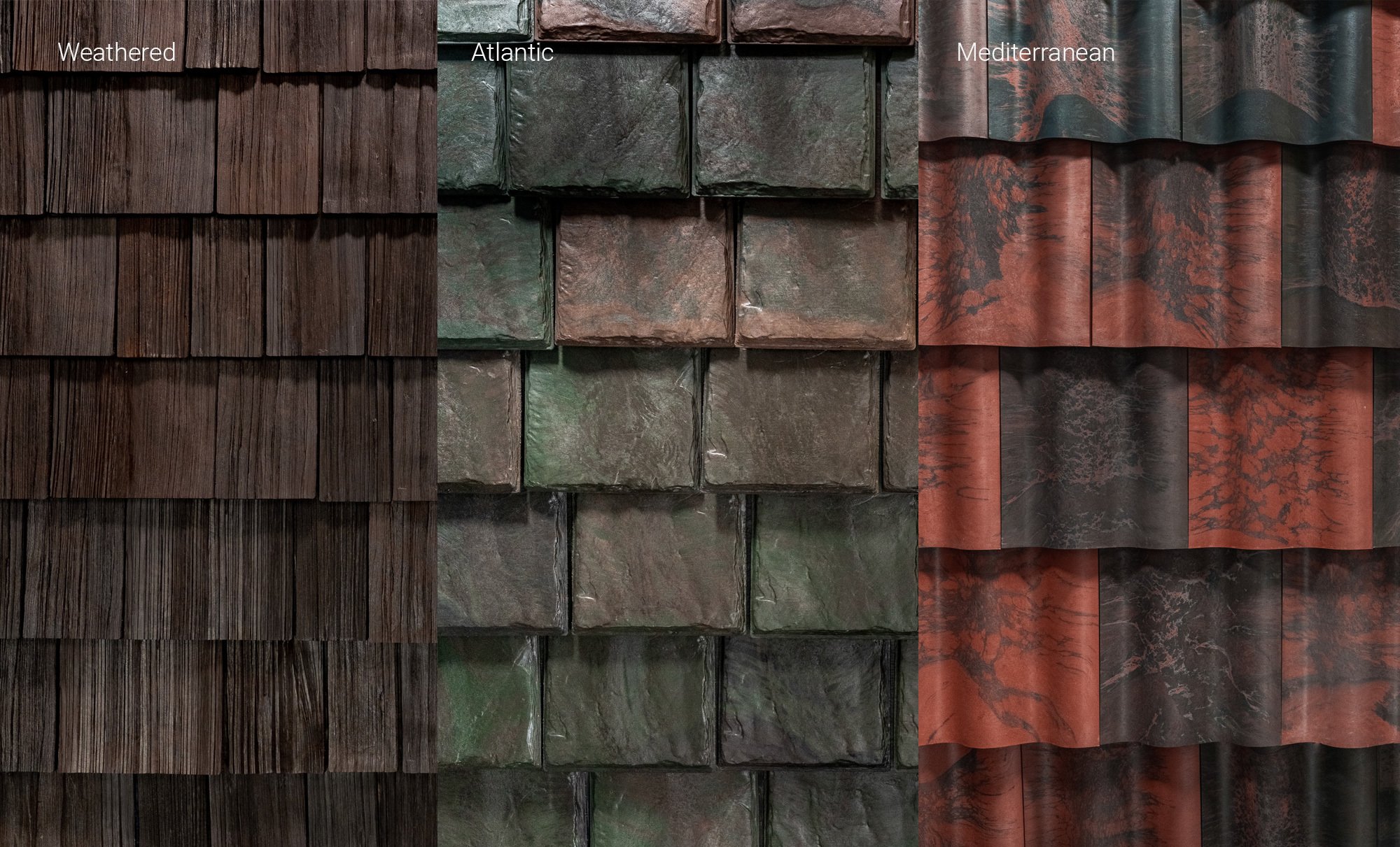 Our molds are made from real cedar shake, slate, and Spanish barrel tiles. These authentic textures enhance the appearance of color and provide a matte finish to reduce glare and create a natural look—without the artificial sheen of gloss-coated products.